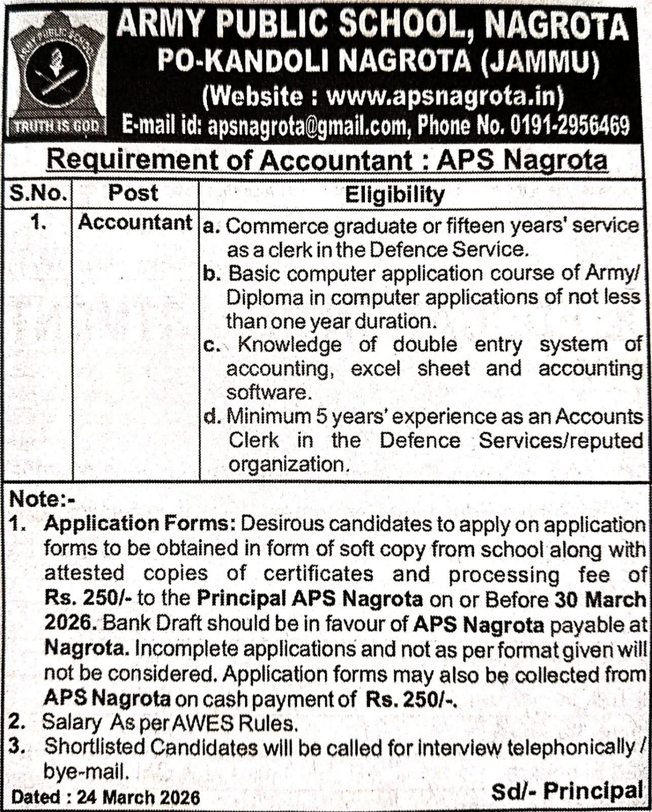 Army Public School Nagrota has released the official notification inviting applications from interested and eligible candidates for Accountant post. There is 01 vacancy open for the mentioned position in the administrative section of the school.