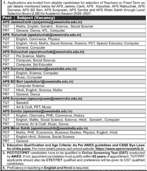 Army Public School, Western Command โ Cluster-19 Jammu has released an official recruitment notice for teaching posts for the academic session 2026โ2027. Applications are invited for PGT, TGT and PRT posts on a Fixed Term Basis through the Local Selection Board as per AWES guidelines.