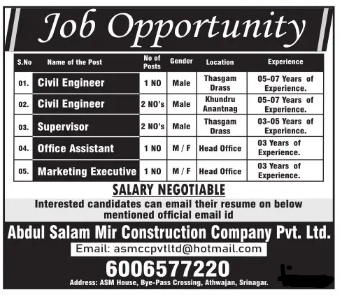Abdul Salam Mir Construction Company Pvt. Ltd. has released a recruitment notice inviting applications from interested and eligible candidates for multiple posts in its projects across Jammu & Kashmir and Ladakh. There are 07 vacancies available for Civil Engineer, Supervisor, Office Assistant and Marketing Executive posts.