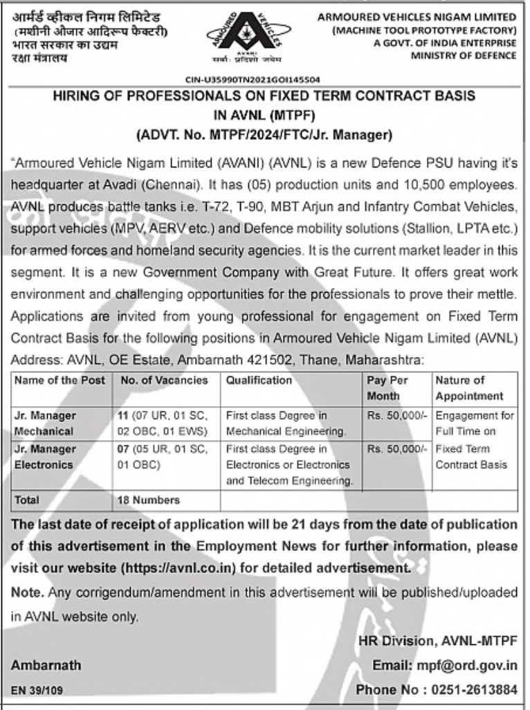 Selected candidates will be engaged on a Fixed-Term Contract Basis for an appropriate duration as per project requirements. The place of posting will be AVNL, OE Estate, Ambarnath, Thane, Maharashtra.