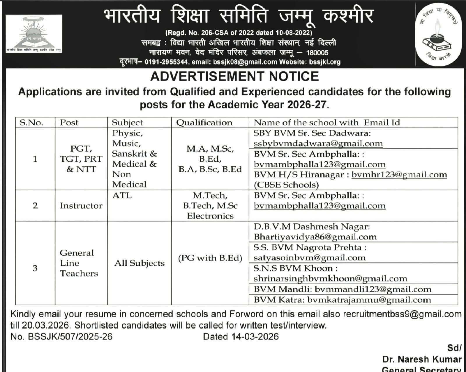 Bhartiya Shiksha Samiti Jammu & Kashmir has released an advertisement inviting applications from qualified and experienced candidates for various teaching and instructor posts for the academic year 2026-27.