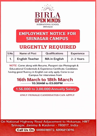 Birla Open Minds International School, Srinagar has released an employment notice inviting applications for teaching positions at its Srinagar campus. The school is looking for qualified candidates for the post of English Teacher.