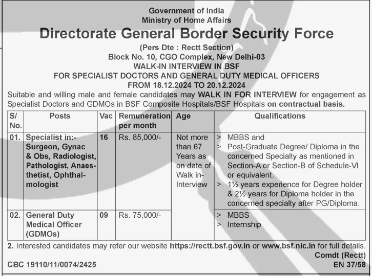 BSF Recruitment 2024: The Directorate General Border Security Force (BSF) has released the official notification inviting applications for Specialist Doctors and General Duty Medical Officers (GDMOs) posts. There are 25 vacancies open on a contractual basis in BSF Composite Hospitals and BSF Hospitals.