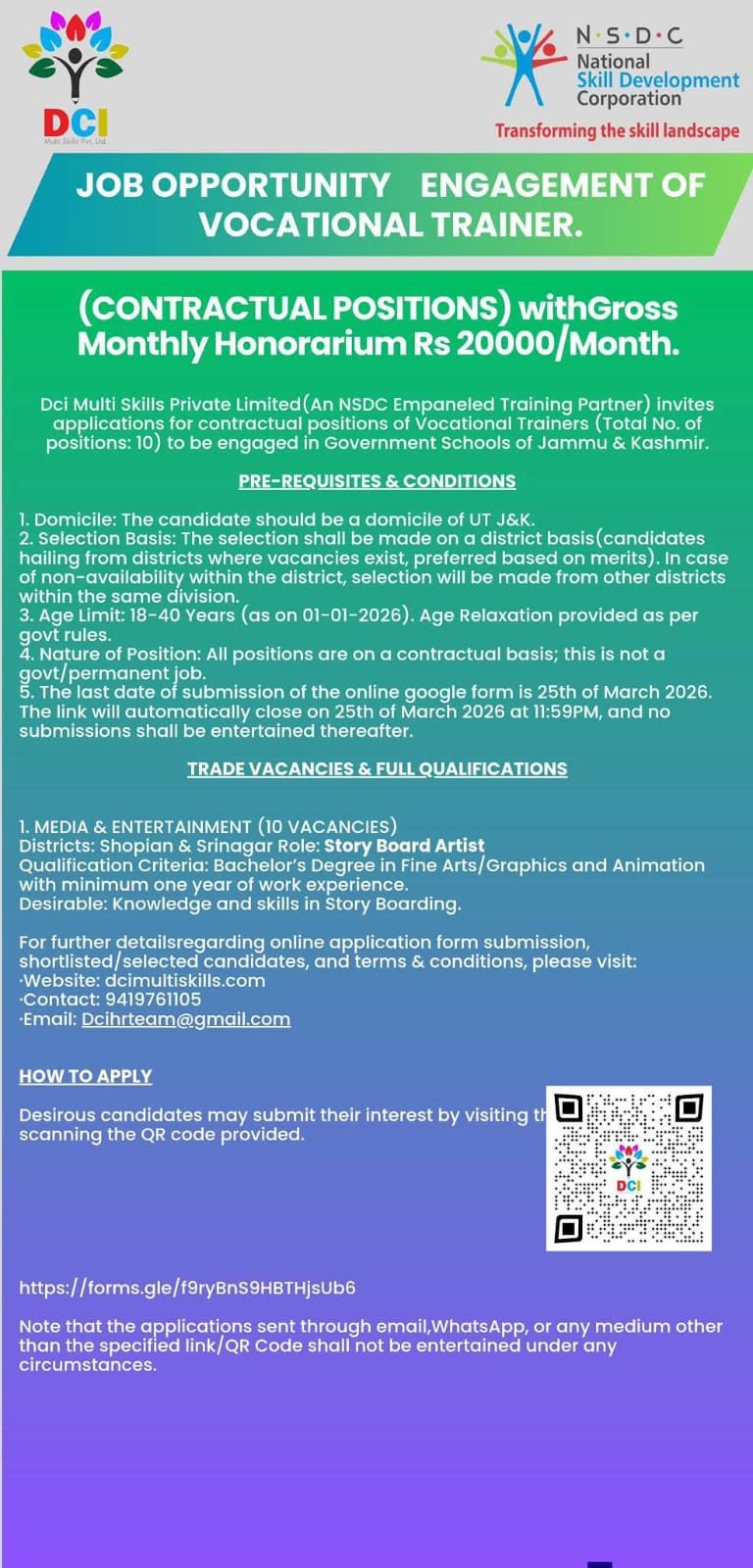 DCI Multi Skills Private Limited, an NSDC empaneled training partner, has released a job notification for the engagement of Vocational Trainers on a contractual basis in Jammu & Kashmir.