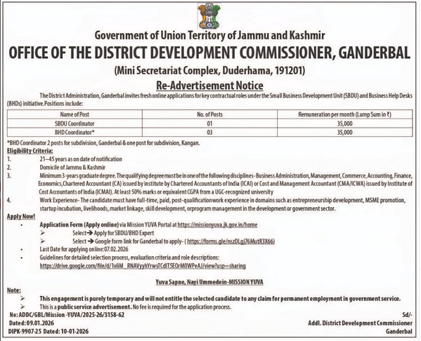 The Office of the District Development Commissioner, Ganderbal has issued a re-advertisement notice inviting fresh online applications for contractual posts under the Mission YUVA initiative. The recruitment is aimed at strengthening the Small Business Development Unit and Business Help Desks in the district.