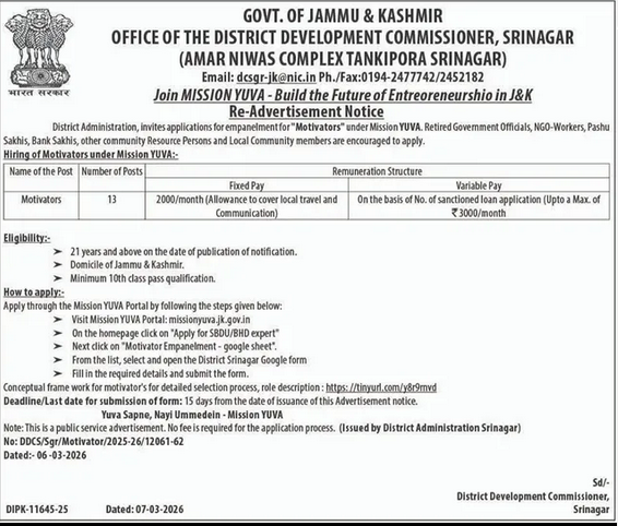 Government of Jammu & Kashmir, Office of the District Development Commissioner Srinagar has released a re-advertisement notice inviting applications for Motivator posts under Mission YUVA โ€“ Build the Future of Entrepreneurship in J&K. The recruitment is aimed at engaging suitable individuals to support the Mission YUVA initiative in the district.