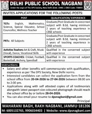 Delhi Public School (DPS) Nagbani, Jammu has invited applications from eligible candidates for various teaching and non-teaching positions including TGTs, PRTs, Activity Teachers, Sports Coaches, Special Educator and School Counsellor posts.