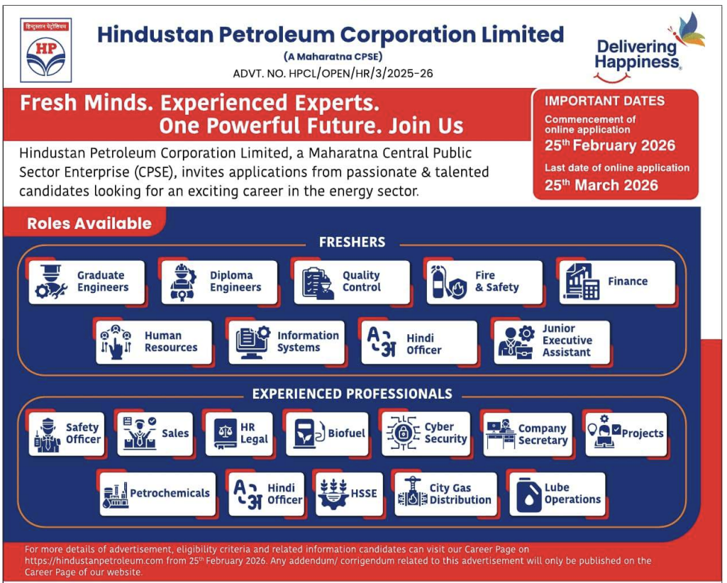 Hindustan Petroleum Corporation (HPCL) has released a short notice, inviting online applications from both freshers and experienced professionals for various technical, executive, and professional roles. The detailed advertisement will be published on 25 February 2026 on the official HPCL careers portal.