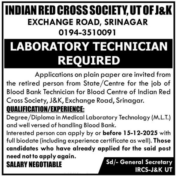 Indian Red Cross Society, UT of Jammu & Kashmir, has invited applications for the post of Laboratory Technician for the Blood Centre at Exchange Road, Srinagar. The post is open to retired candidates from State or Central services with relevant experience.