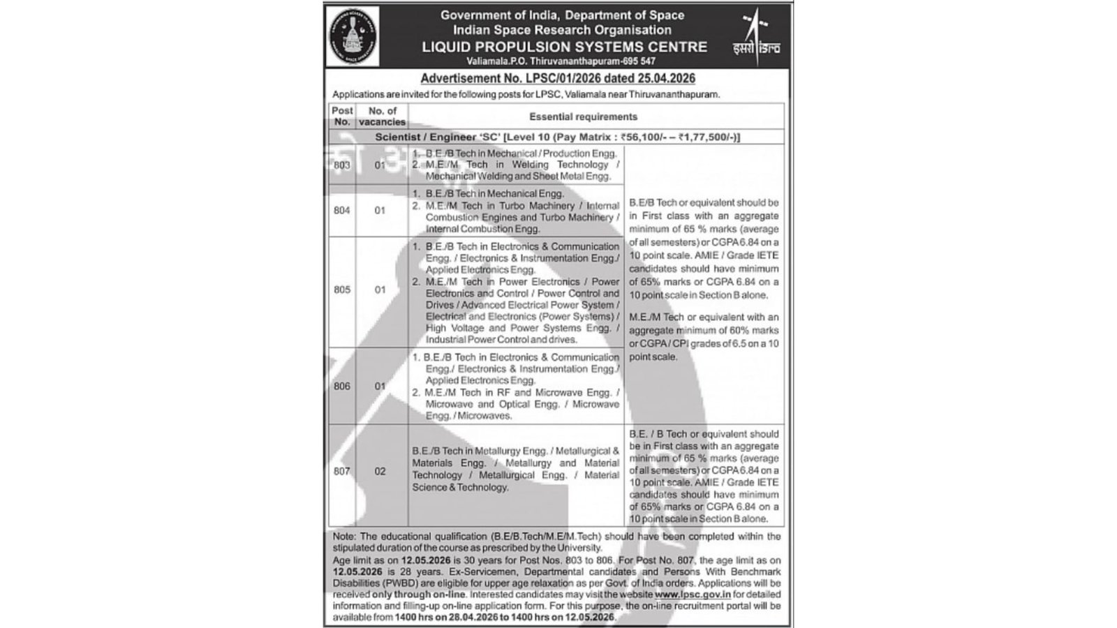 The Indian Space Research Organisation (ISRO) Liquid Propulsion Systems Centre (LPSC) has released an official recruitment notification for the post of Scientist/Engineer โ€˜SCโ€™ under Advertisement No. LPSC/01/2026. The notification was released on 25 April 2026 and eligible candidates can apply online through the official website.