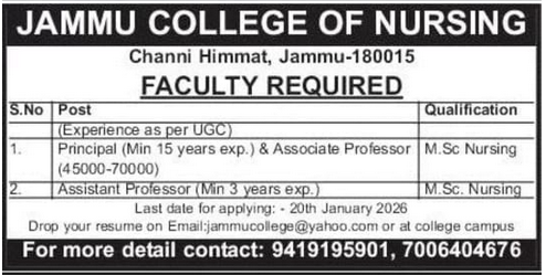 Jammu College of Nursing has released an official notification inviting applications from eligible nursing professionals for faculty positions for the academic session 2026. The recruitment is for senior and junior teaching roles at the college campus located in Channi Himmat, Jammu.