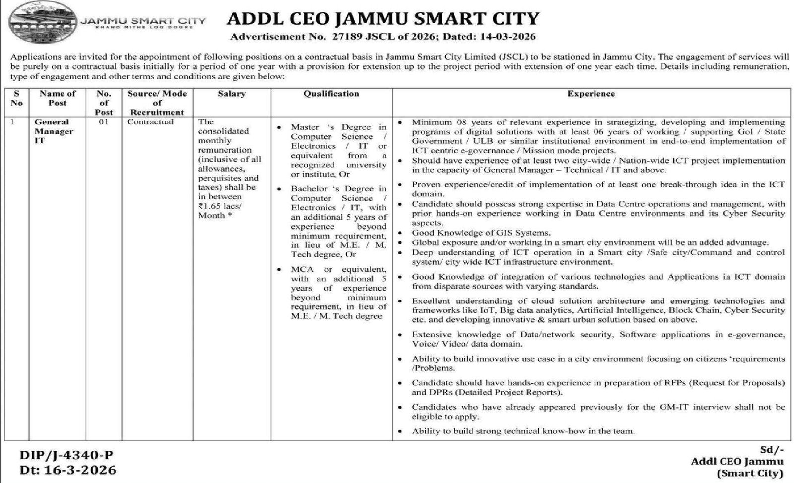 Jammu Smart City Limited has released the official notification inviting applications from eligible candidates for the post of General Manager (IT). The recruitment is being conducted on a contractual basis for deployment in Jammu City.