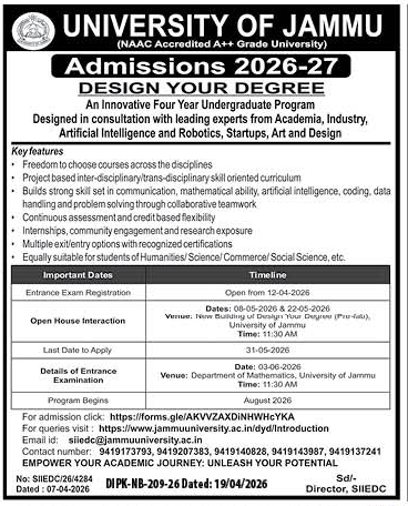 University of Jammu has released the official admission notification for the innovative four-year undergraduate programme titled “Design Your Degree” for the academic session 2026–27. The programme is designed in consultation with leading experts from academia, industry, artificial intelligence, robotics, startups, art and design.