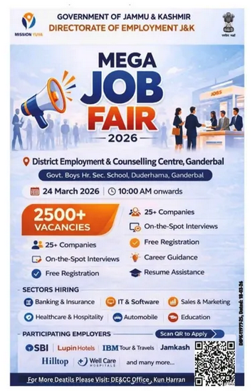 Directorate of Employment J&K has announced a Mega Job Fair 2026 for job seekers in the Union Territory. The event will be held at District Employment & Counselling Centre, Ganderbal.
