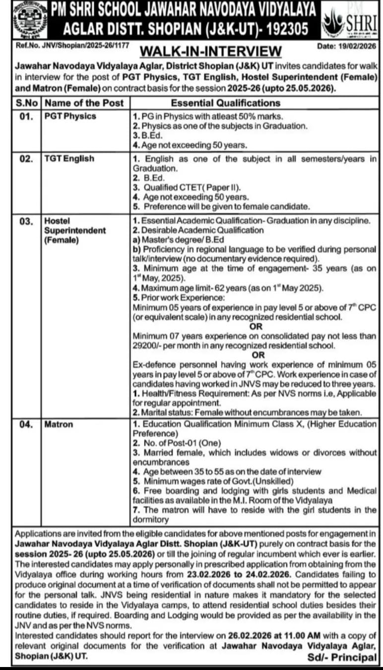 Jawahar Navodaya Vidyalaya Aglar, District Shopian (J&K-UT) has issued a walk-in-interview notification for engagement of teaching and non-teaching staff on contract basis for the academic session 2025โ26.