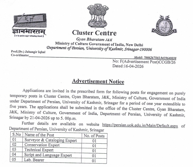 Cluster Centre, Gyan Bharatam J&K under the Ministry of Culture, Government of India, Department of Persian, University of Kashmir, Srinagar has released an advertisement inviting applications for multiple temporary posts. The recruitment will be carried out for various expert and support staff positions for a period of one year, which may be extended up to five years based on project requirements.