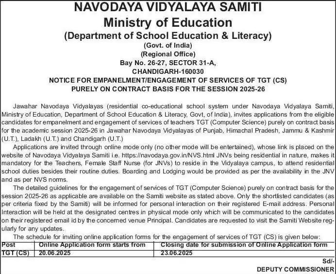 Jawahar Navodaya Vidyalayas (Navodaya Vidyalaya Samiti) has released an official notification for engagement of services of Trained Graduate Teachers (TGT) in Computer Science on a purely contract basis. These appointments will be made for the academic session 2025-26 across various Jawahar Navodaya Vidyalayas.