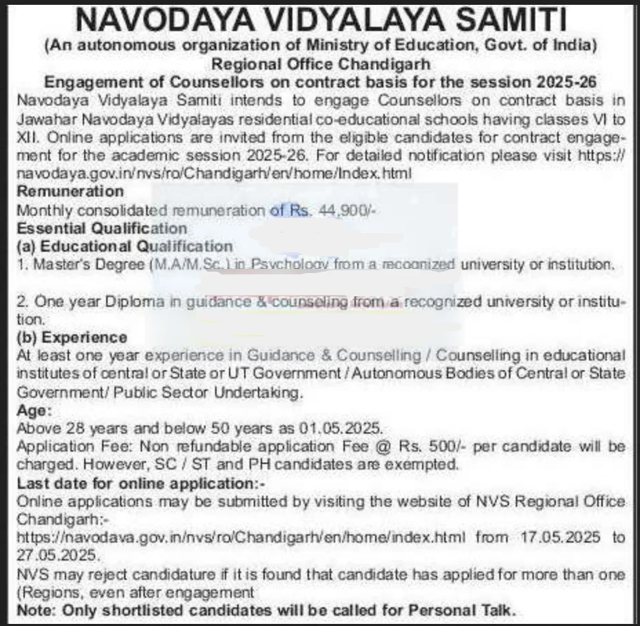 Navodaya Vidyalaya Samiti (NVS), Chandigarh Region has officially released a notification inviting applications for the engagement of Counsellors on a contractual basis for the academic session 2025–26. These positions are meant for Jawahar Navodaya Vidyalayas, which are co-educational residential schools operating under the Ministry of Education, Government of India, with classes from VI to XII.