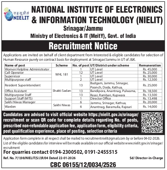 The National Institute of Electronics and Information Technology (NIELIT), Srinagar/Jammu has released a recruitment notice for engagement of manpower on a contract basis. The recruitment is being conducted on behalf of a client department for deployment across various districts of the Union Territory of Jammu and Kashmir.