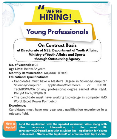 The Directorate of National Service Scheme (NSS), under the Department of Youth Affairs, Ministry of Youth Affairs and Sports, Government of India, has released a notification inviting applications for the post of Young Professional on a contract basis. A total of 02 vacancies are available under this recruitment.