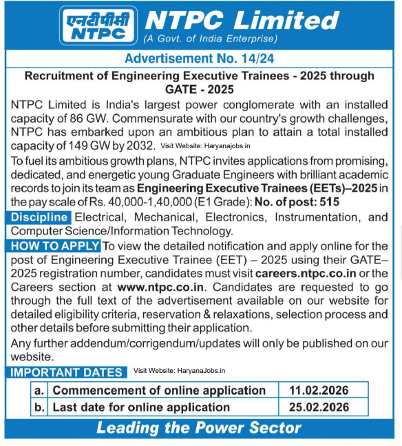 NTPC Limited has released Advertisement No. 14/24 for recruitment of Engineering Executive Trainees (EETs) through GATE 2025. A total of 515 vacancies are available in different engineering disciplines.