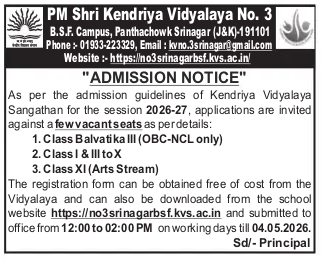 PM Shri Kendriya Vidyalaya No. 3, B.S.F. Campus Panthachowk Srinagar, has released an official admission notice for the academic session 2026–2027. Applications are invited from eligible candidates for admission into Balvatika, Classes I to III, and Class XI (Arts Stream).