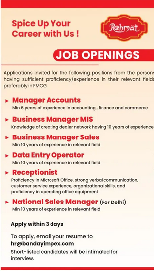 Rehmat Spices has invited applications from eligible candidates for multiple job openings in accounts, MIS, sales, data entry, and reception roles. Candidates having relevant experience, preferably in FMCG sector, are encouraged to apply.