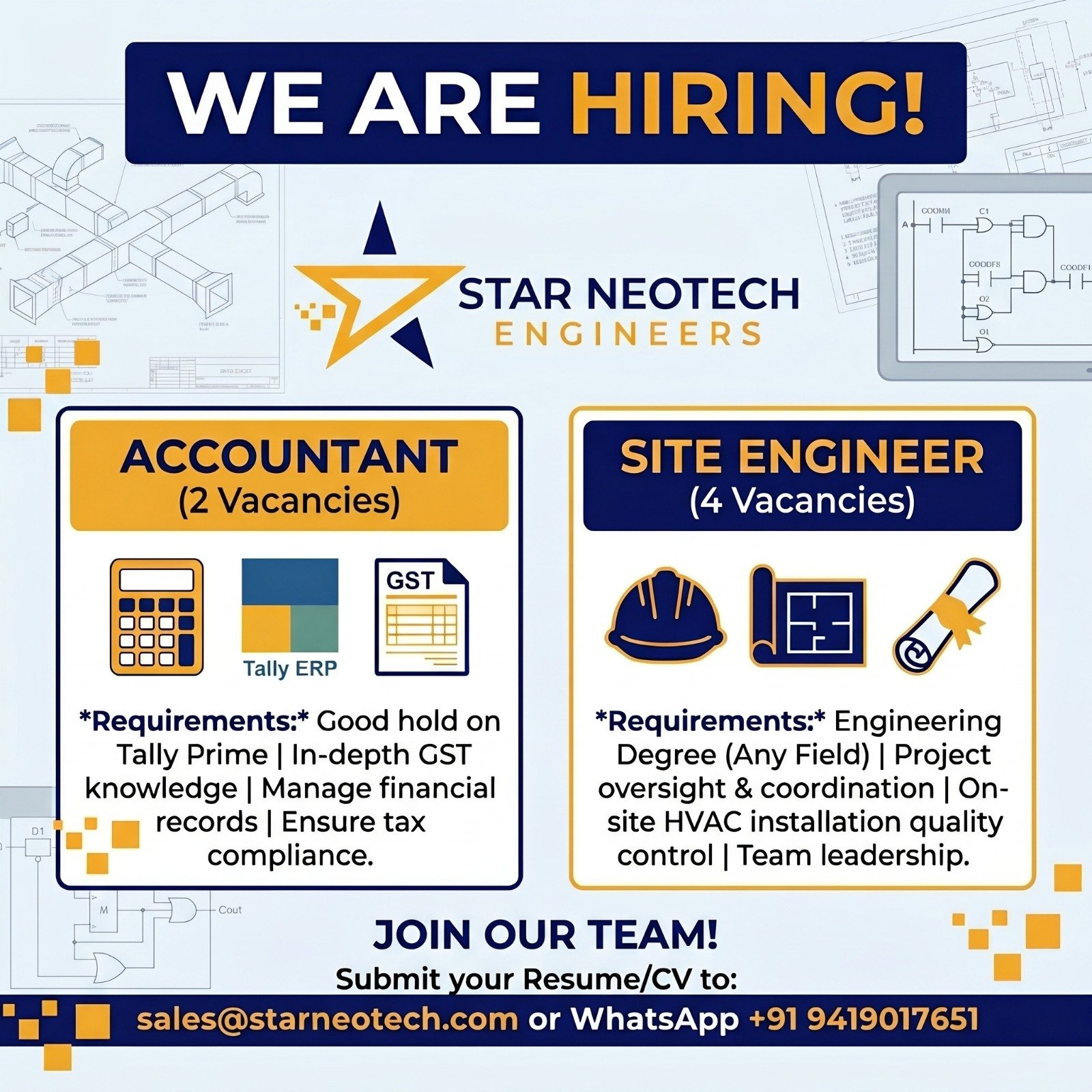 Star Neotech Engineers has released a hiring notification inviting applications from interested and eligible candidates for Accountant and Site Engineer posts. There are a total of 6 vacancies available for the mentioned positions.