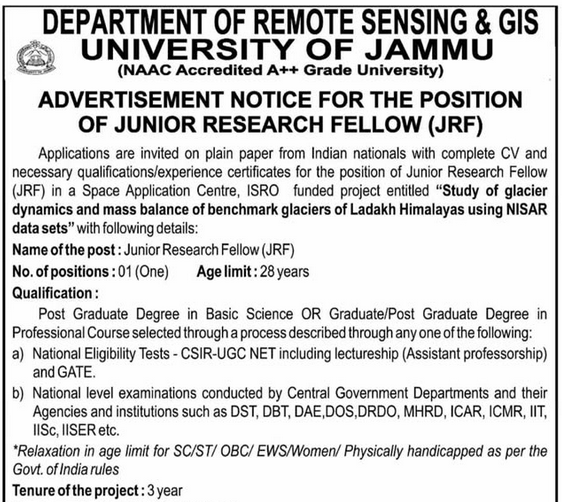 The University of Jammu, a NAAC Accredited A++ Grade University, has released an advertisement through its Department of Remote Sensing & GIS inviting applications from eligible candidates for the Junior Research Fellow (JRF) post. There is 01 vacancy available under an ISRO-funded research project.