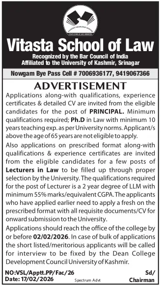 Vitasta School of Law, recognized by the Bar Council of India and affiliated to the University of Kashmir, Srinagar, has issued an advertisement inviting applications from eligible candidates for academic posts. The recruitment is for the position of Principal and a few posts of Lecturer in Law.